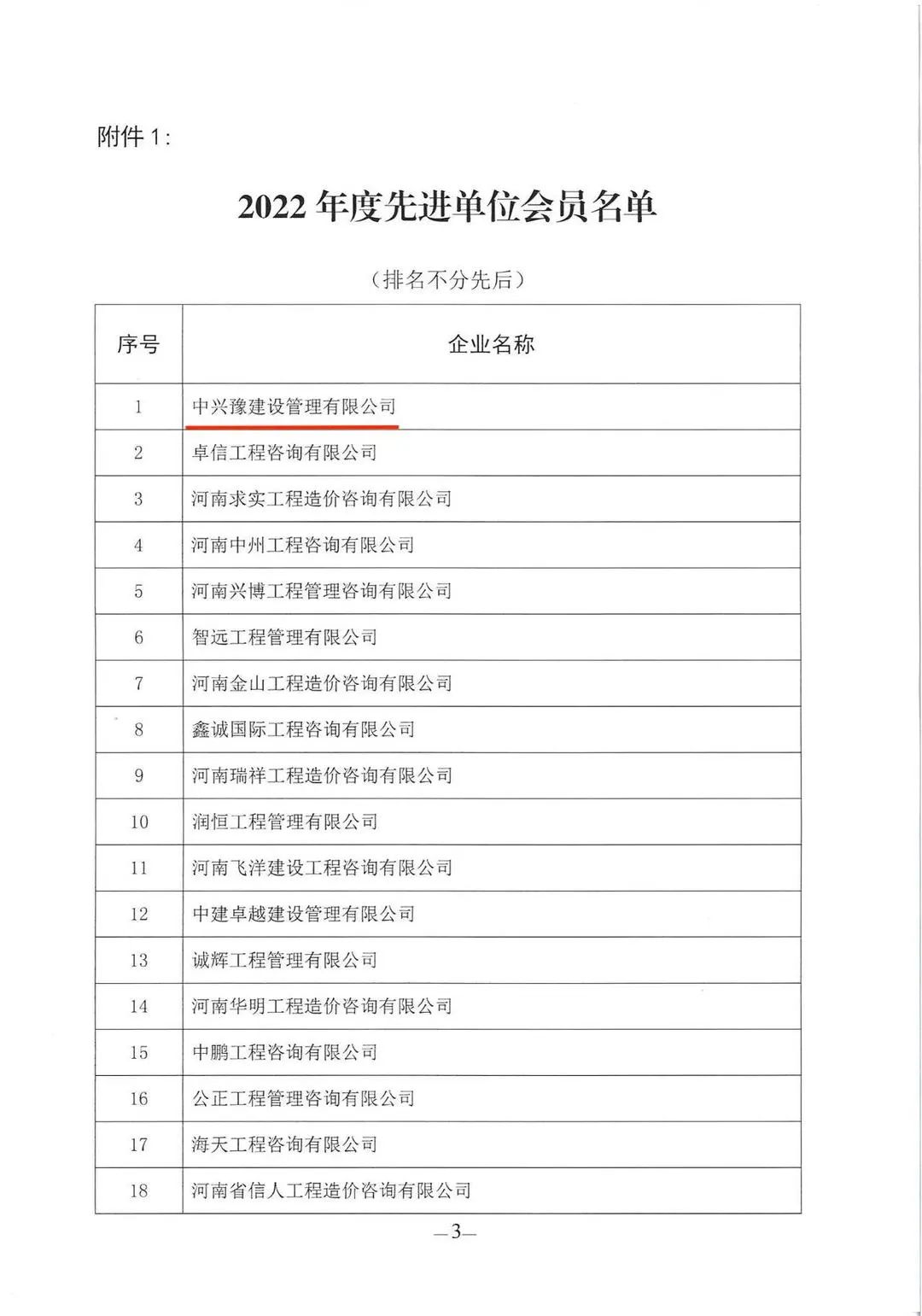 近日,河南省注冊造價(jià)工程師協(xié)會公布了“河南省注冊造價(jià)工程師協(xié)會2022年度先進(jìn)單位會員、先進(jìn)個(gè)人會員的通告”。我公司榮獲河南省注冊造價(jià)工程師協(xié)會2022年度先進(jìn)單位會員榮譽(yù)稱號,徐文、李杰、賈世軍三位同志獲得先進(jìn)個(gè)人會員的榮譽(yù)。
