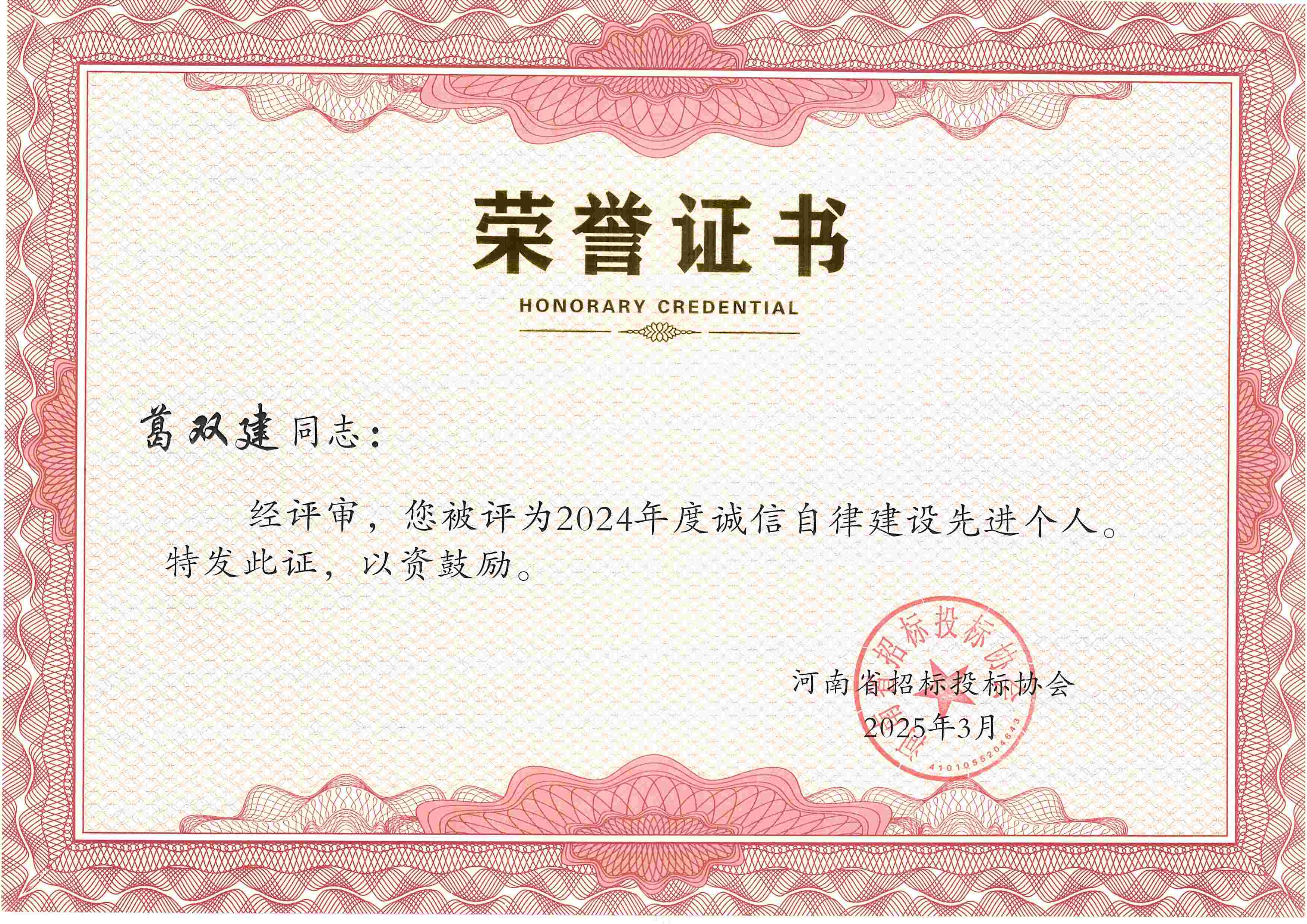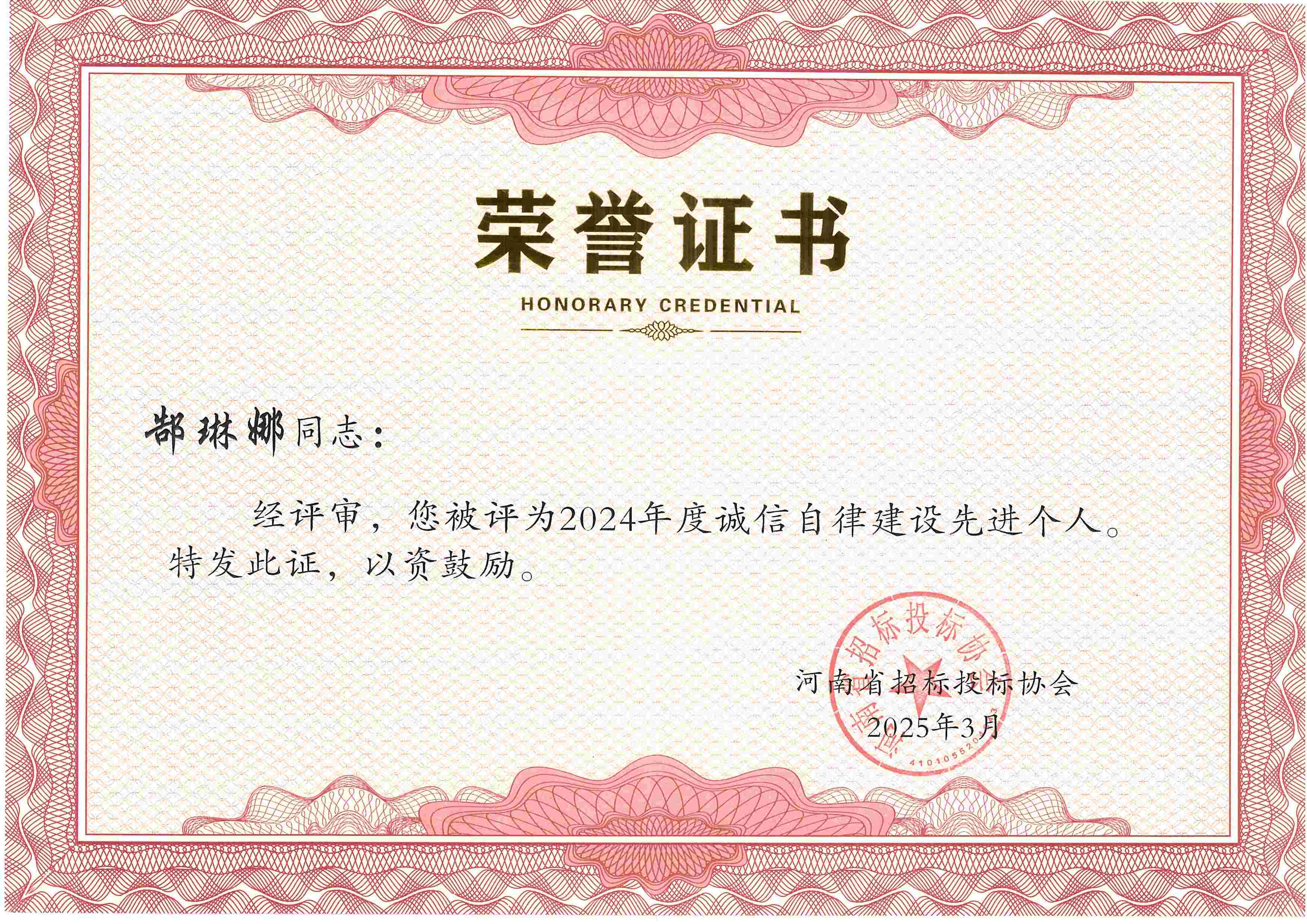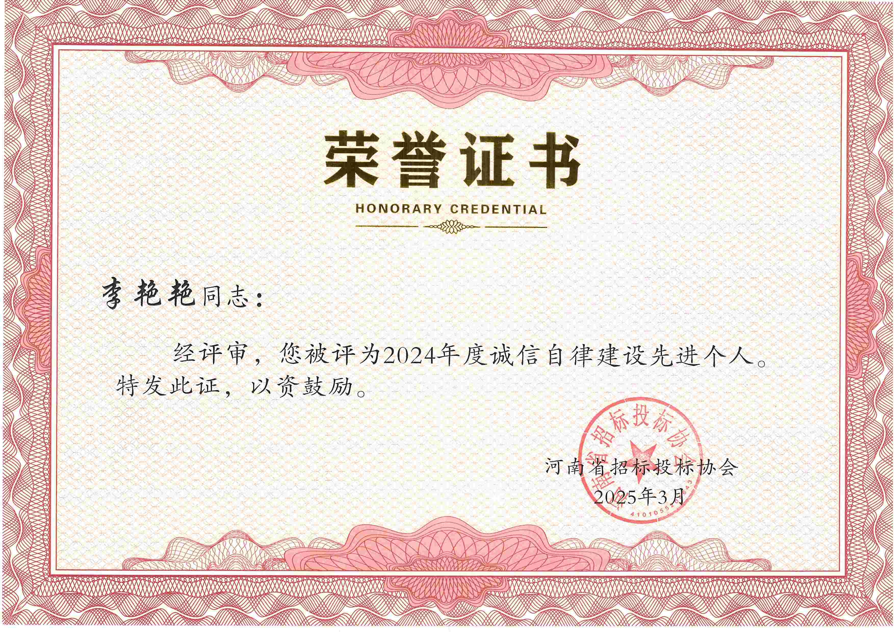 張彥令、李杰、鄭寧飛、郜琳娜、李艷艷、葛雙建、劉穎、黃業(yè)耿8位同志榮獲2024年度誠信自律建設(shè)先進(jìn)個(gè)人稱號(hào)。