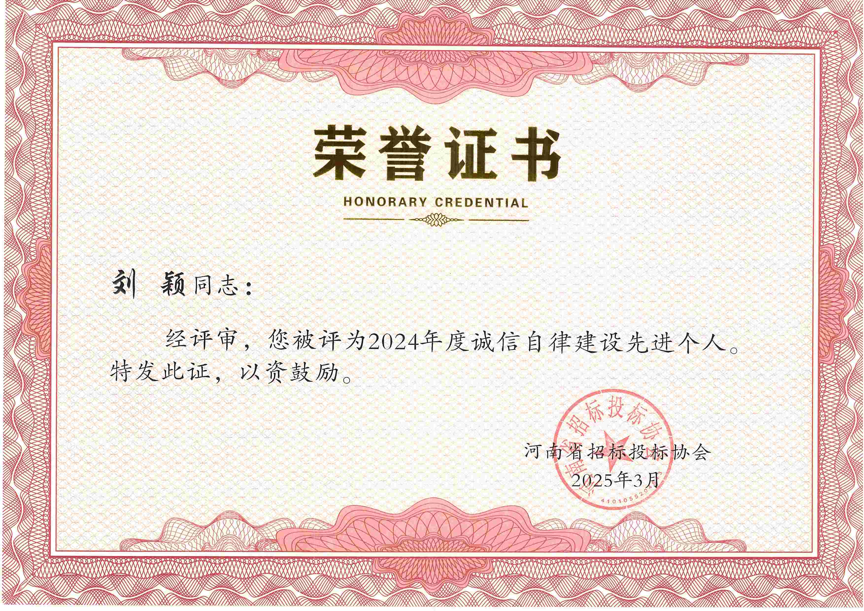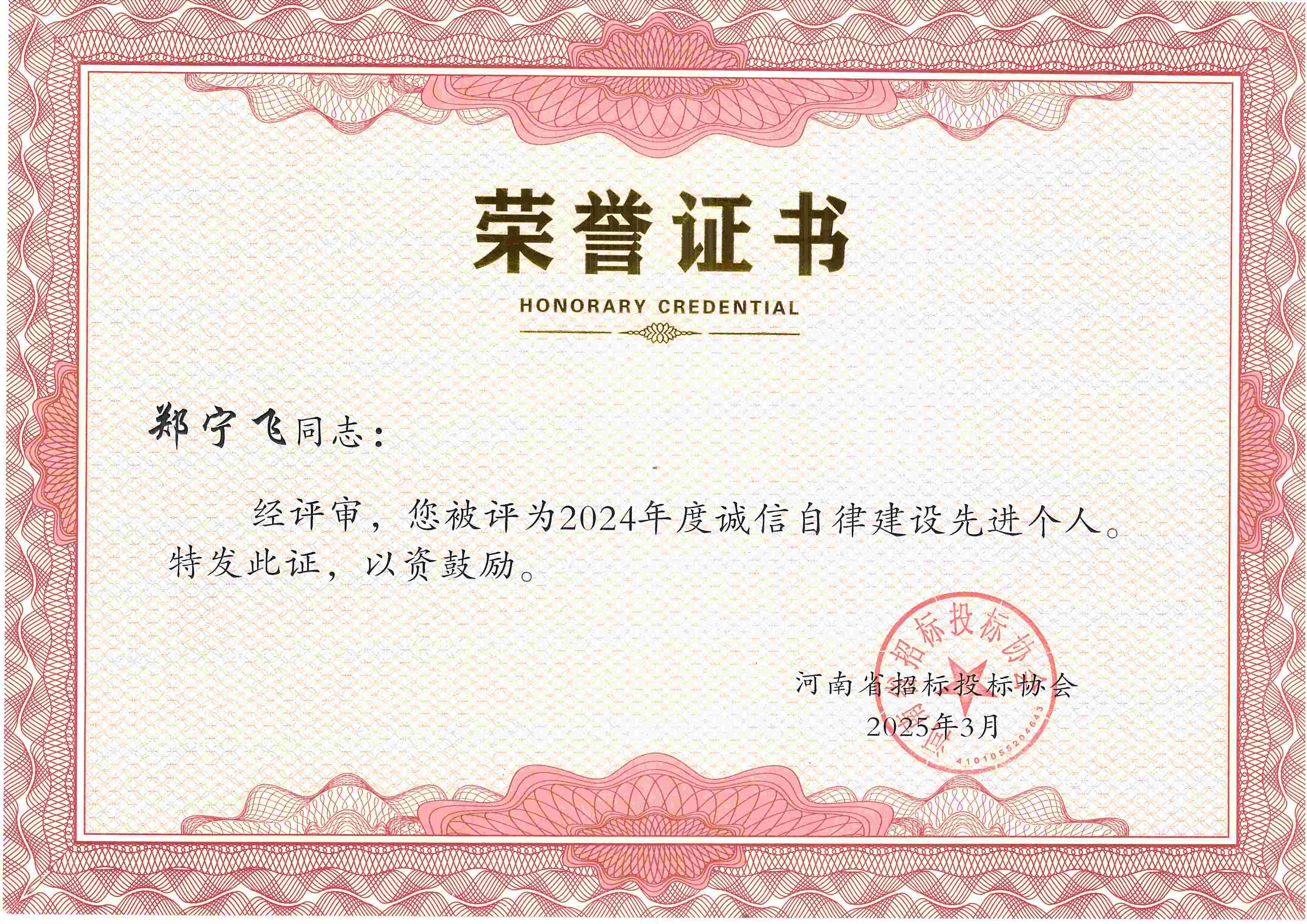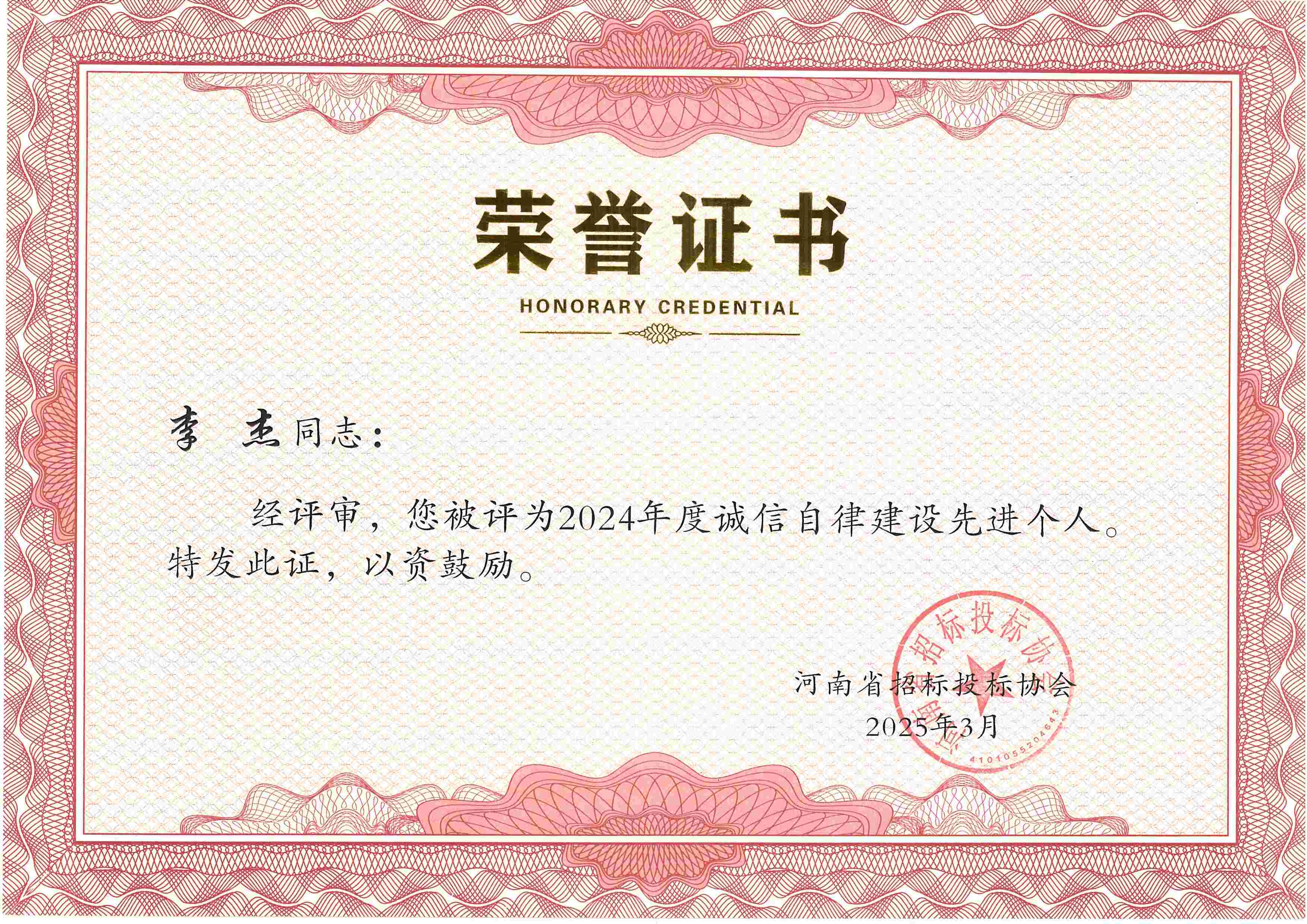 張彥令、李杰、鄭寧飛、郜琳娜、李艷艷、葛雙建、劉穎、黃業(yè)耿8位同志榮獲2024年度誠信自律建設(shè)先進(jìn)個(gè)人稱號(hào)。