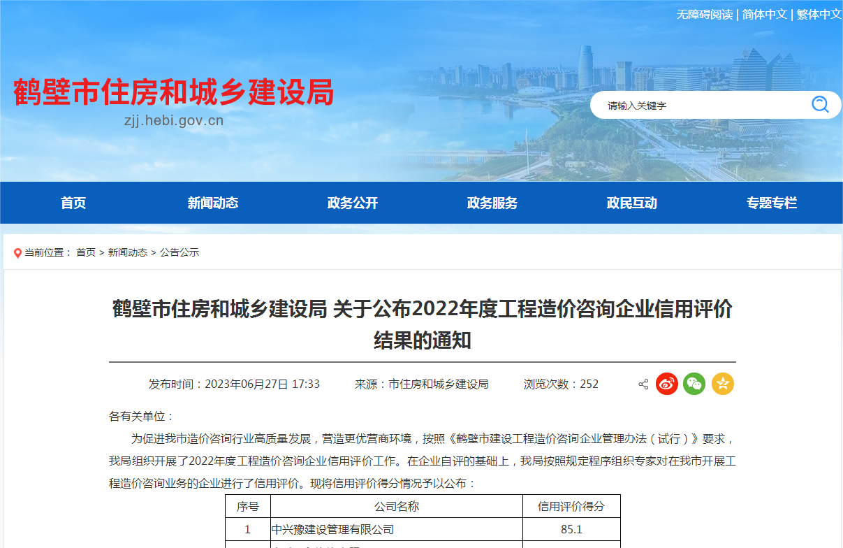 近日,鶴壁市住房和城鄉(xiāng)建設(shè)局公布了“2022年度工程造價(jià)咨詢企業(yè)信用評(píng)價(jià)結(jié)果的通告”。經(jīng)企業(yè)自評(píng)、專家評(píng)審等程序,中興豫建設(shè)管理有限公司信用評(píng)價(jià)得分位居第一。