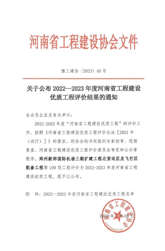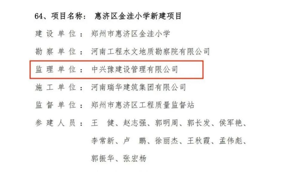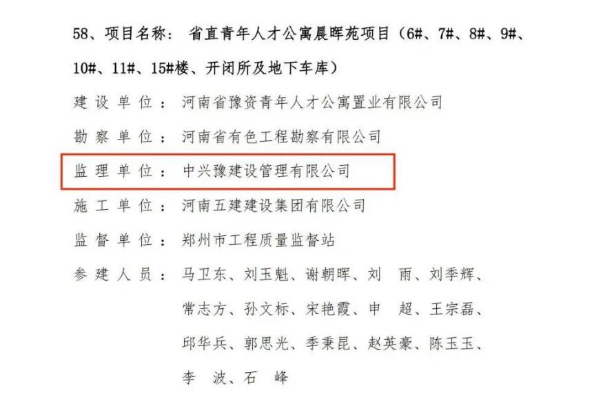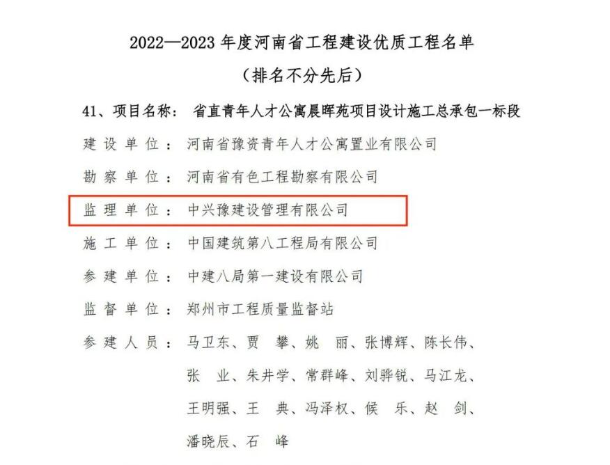 近日,河南省工程建設(shè)協(xié)會(huì)公布了“2022-2023年度河南省工程建設(shè)優(yōu)質(zhì)工程評(píng)價(jià)結(jié)果的通知”,由中興豫建設(shè)管理有限公司擔(dān)任監(jiān)理單位的“省直青年人才公寓晨暉苑項(xiàng)目設(shè)計(jì)施工總承包一標(biāo)段”、“省直青年人才公寓晨暉苑項(xiàng)目(6#、7#、8#、9#、10#、11#、15#樓、開閉所及地下車庫)”、“惠濟(jì)區(qū)金洼小學(xué)新建項(xiàng)目”,共三項(xiàng)目齊上榜,紛紛獲得省級(jí)榮譽(yù)。