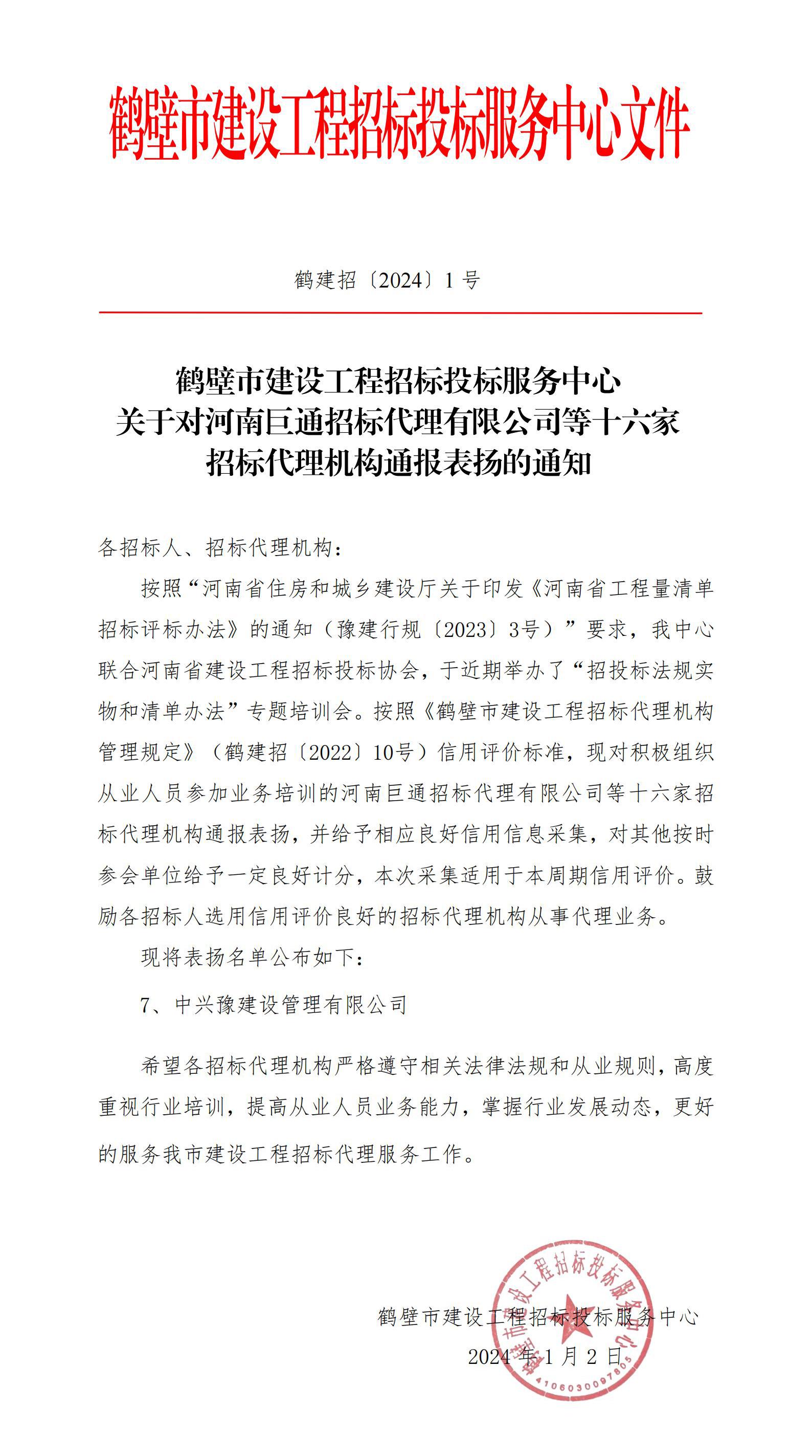 近日,鶴壁市建設工程招標投標服務中心發(fā)布了《關于對河南巨通招標代理有限公司等十六家招標代理機構通報表揚的通知》,對積極組織從業(yè)人員參加業(yè)務培訓的代理機構通報表揚,中興豫建設管理有限公司榜上有名,同時鼓勵各招標人選用信用評價良好的招標代理機構從事代理業(yè)務。