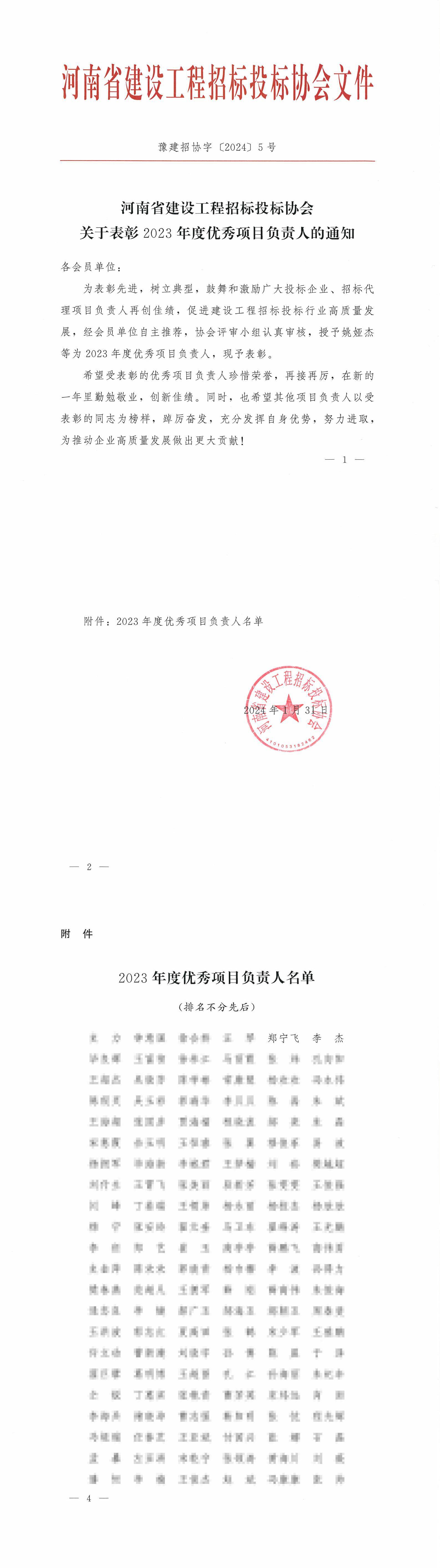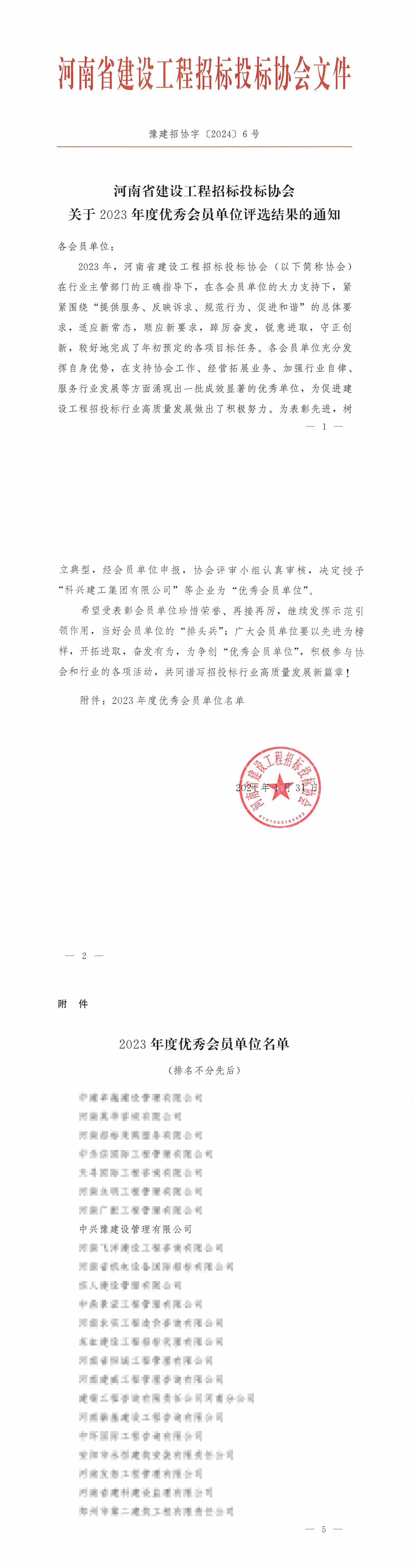 近日,河南省建設工程招標投標協(xié)會公布了“關于2023年度優(yōu)秀會員單位評選結果的通知”。經會員單位申報、協(xié)會評審小組認真審核等程序,我公司榮獲優(yōu)秀會員單位榮譽稱號,李杰、鄭寧飛榮獲優(yōu)秀項目負責人榮譽稱號。