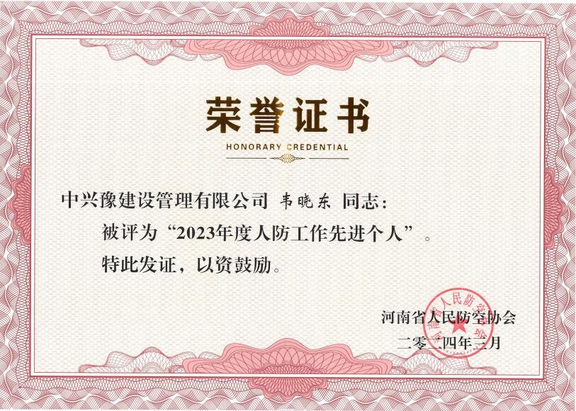 近日,河南省人民防空協(xié)會(huì)頒發(fā)了關(guān)于優(yōu)秀會(huì)員單位及先進(jìn)工作者的榮譽(yù)證書,我公司核準(zhǔn)為河南省人民防空協(xié)會(huì)第四屆副會(huì)長單位、2023年度人防行業(yè)先進(jìn)單位,工程監(jiān)理中心總經(jīng)理韋曉東榮獲2023年度人防工作先進(jìn)個(gè)人榮譽(yù)稱號。