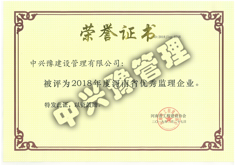 2018年度河南省工程建設(shè)優(yōu)秀監(jiān)理企業(yè)-公司榮譽