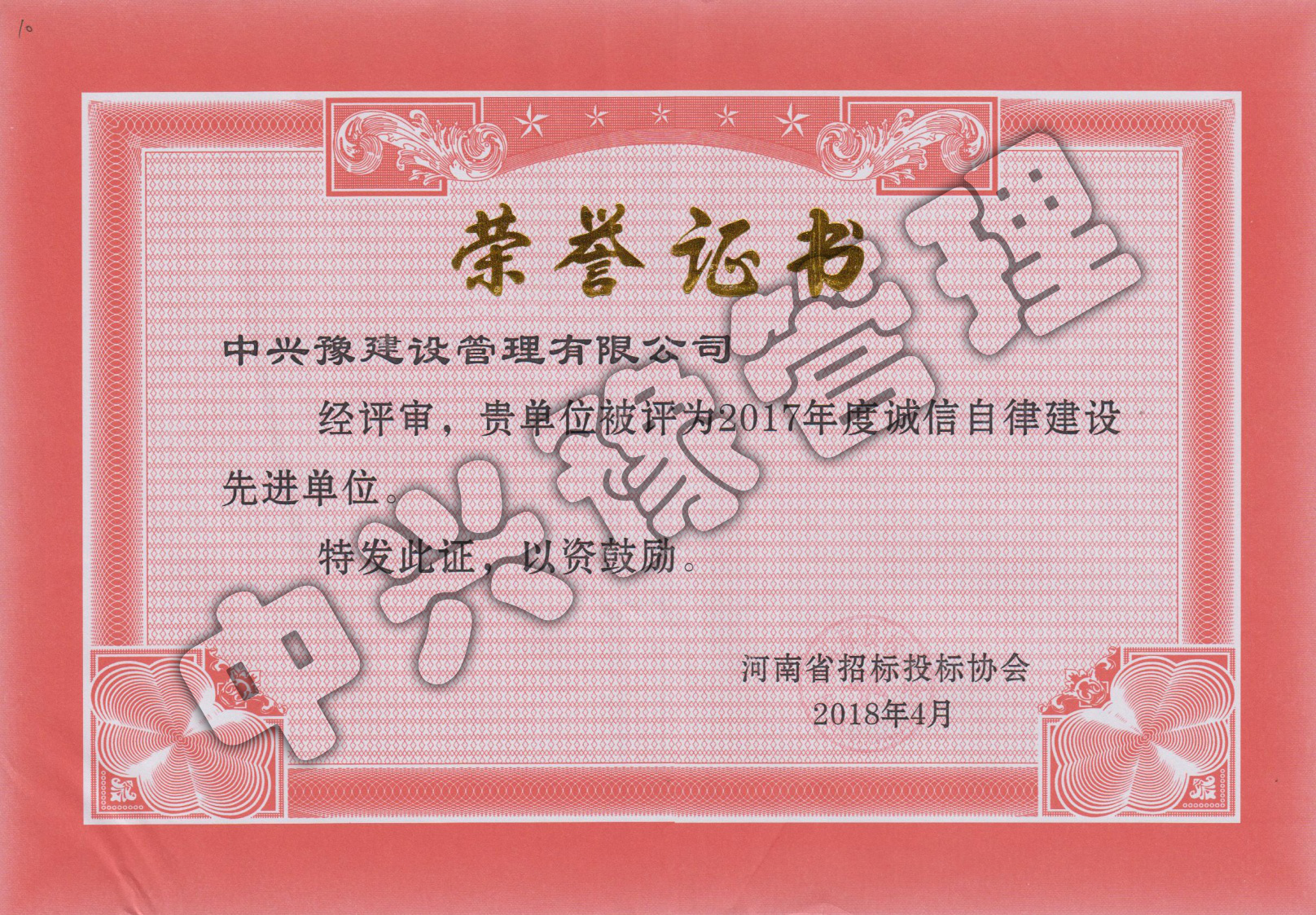 2017年度誠信自律建設(shè)先進(jìn)單位-公司榮譽
