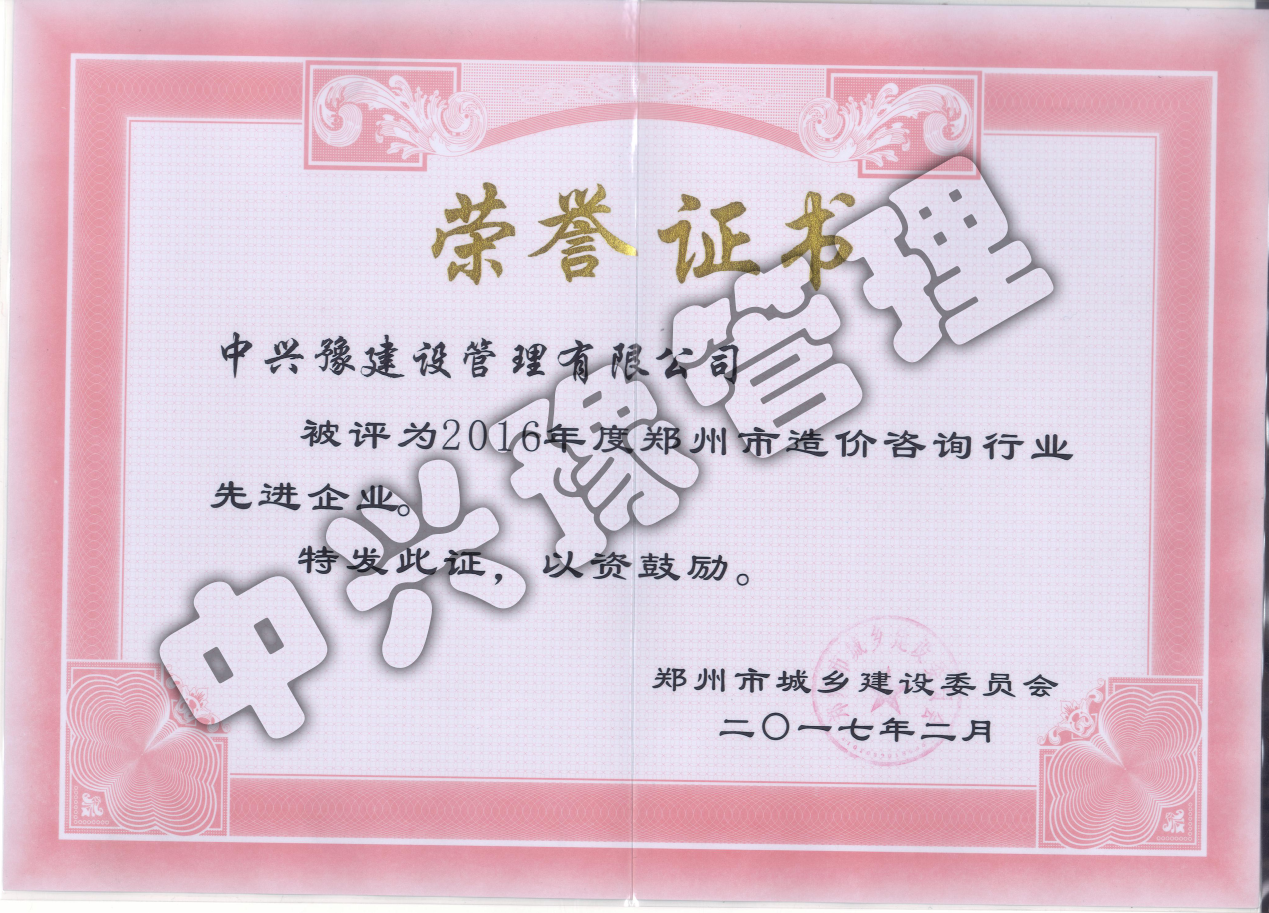 2016年度工程造價先進(jìn)企業(yè)-公司榮譽(yù)