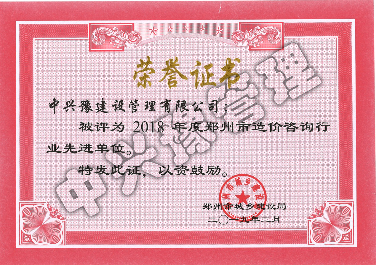 2018年度鄭州市造價咨詢行業(yè)先進單位榮譽證書-公司榮譽