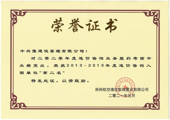 近日,經(jīng)鄭州航空港區(qū)航程置業(yè)有限公司對2013-2015年度、2015-2017年度、2018-2019年度造價咨詢?nèi)雵鷨挝坏穆募s情況進行嚴格、公平、公正的考評,中興豫建設管理有限公司業(yè)績突出,榮獲2013-2015年度造價咨詢?nèi)雵鷨挝弧暗诙?,并授予榮譽證書。