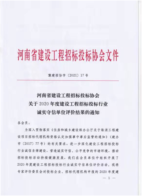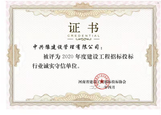 為推動招標投標活動持續(xù)健康發(fā)展,河南省建設工程招標投標協(xié)會在會員單位中組織開展了2020年度建設工程招標投標行業(yè)誠實守信單位評價活動。日前,經(jīng)專家評選,中興豫建設管理有限公司被評為“2020年度建設工程招標投標行業(yè)誠實守信單位”,并授予獲獎證書。