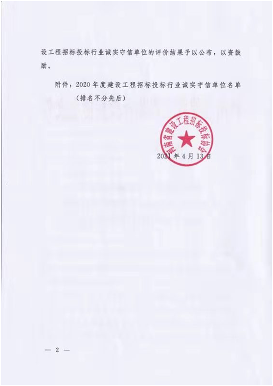 “2020年度建設工程招標投標行業(yè)誠實守信單位”