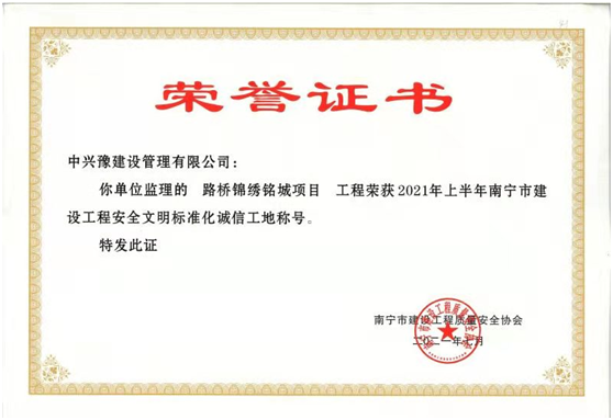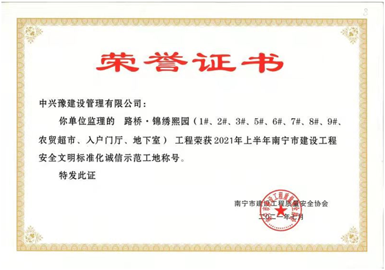 由中興豫建設(shè)管理有限公司監(jiān)理的路橋·錦繡熙園、路橋錦繡銘城項(xiàng)目在施工階段被評(píng)為“2021年上半年南寧市建設(shè)工程安全文明標(biāo)準(zhǔn)化誠(chéng)信示范工地”。
